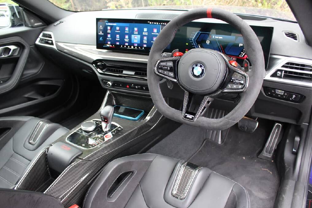 Inside, the CS affords you less than you might want in the way of comfort if this is to be your main mode of transport. No proper central armrest along with extremely bolstered, rigid carbon sports seats (with leg mouldings) and no real storage save for a phone charging pad or the bottle holders in the doors mean the M2 CS doesn’t quite work as a daily drive.