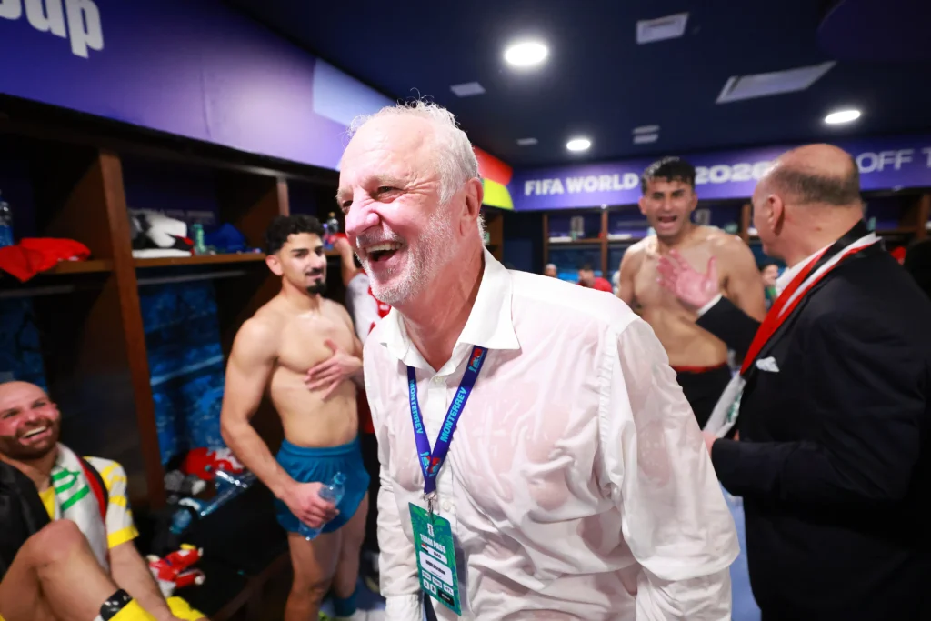 Graham Arnold enjoying the win over Bolivia with Iraq. Photo: Getty Images