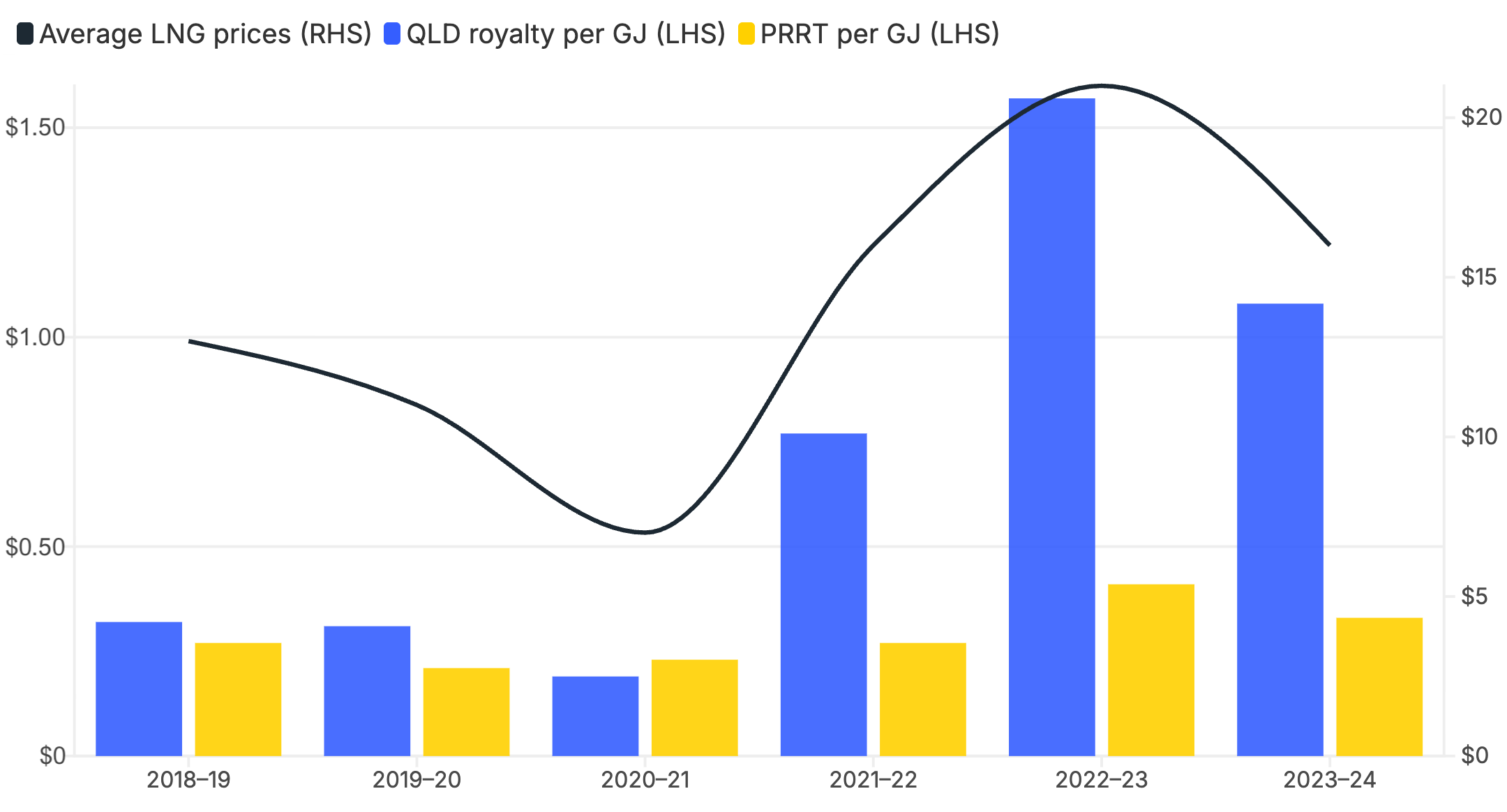For example, from FY2018-19 to FY2023-24, PRRT payments per gigajoule (GJ) of sale gas ranged from AU$0.21-0.41 per gigajoule (GJ), well below Queensland’s royalties of AU$0.19-1.57/GJ over the same period.
