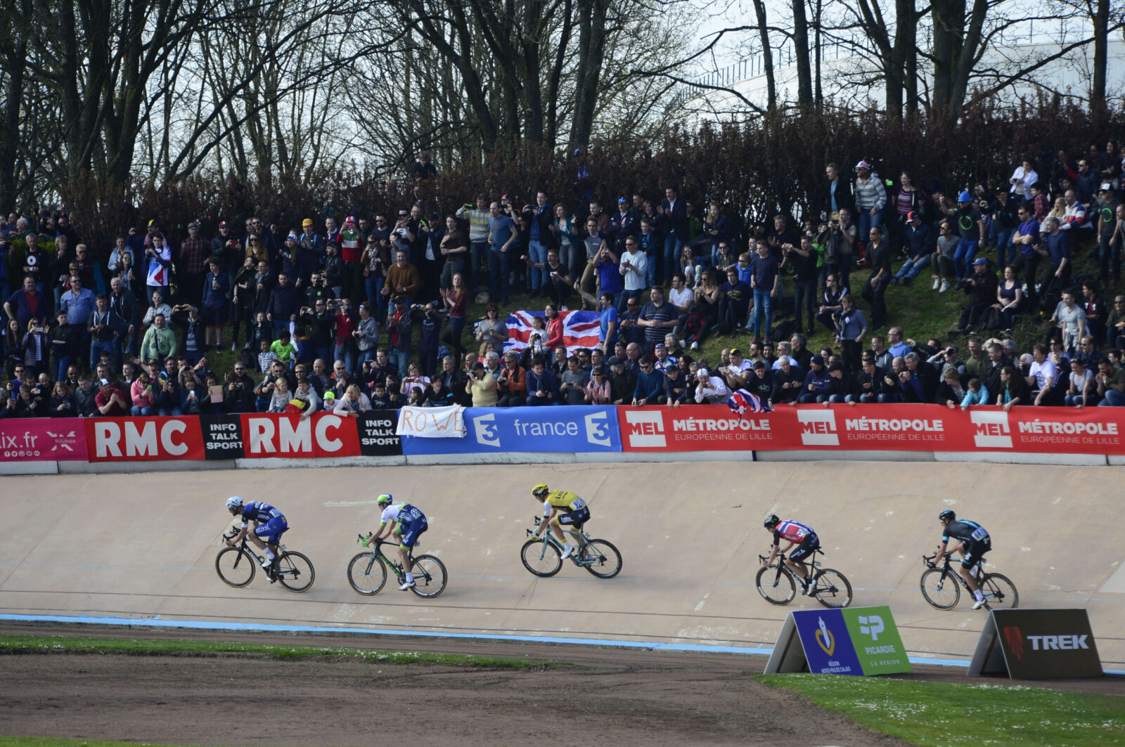 Five riders entered the velodrome in the race’s final kms: Hayman, Tom Boonen, Ian Stannard, Sep Vanmarcke and Edvald Boasson Hagen. Image: Sirotti