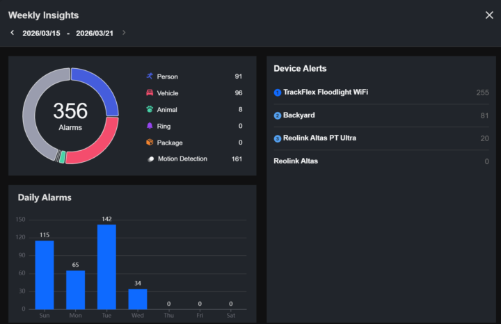 Smartphone apps are how Wi-Fi security cameras are managed across all brands. The Reolink app is good, and all the functionality and views are as you would expect (The Amazon Ring app is the benchmark). What Reolink does differently from other brands is offer a desktop program that gives you the same access from your PC. It is much easier to view live cameras and recordings on a big screen. A handy weekly insights report also gives you an overview of what is going on.