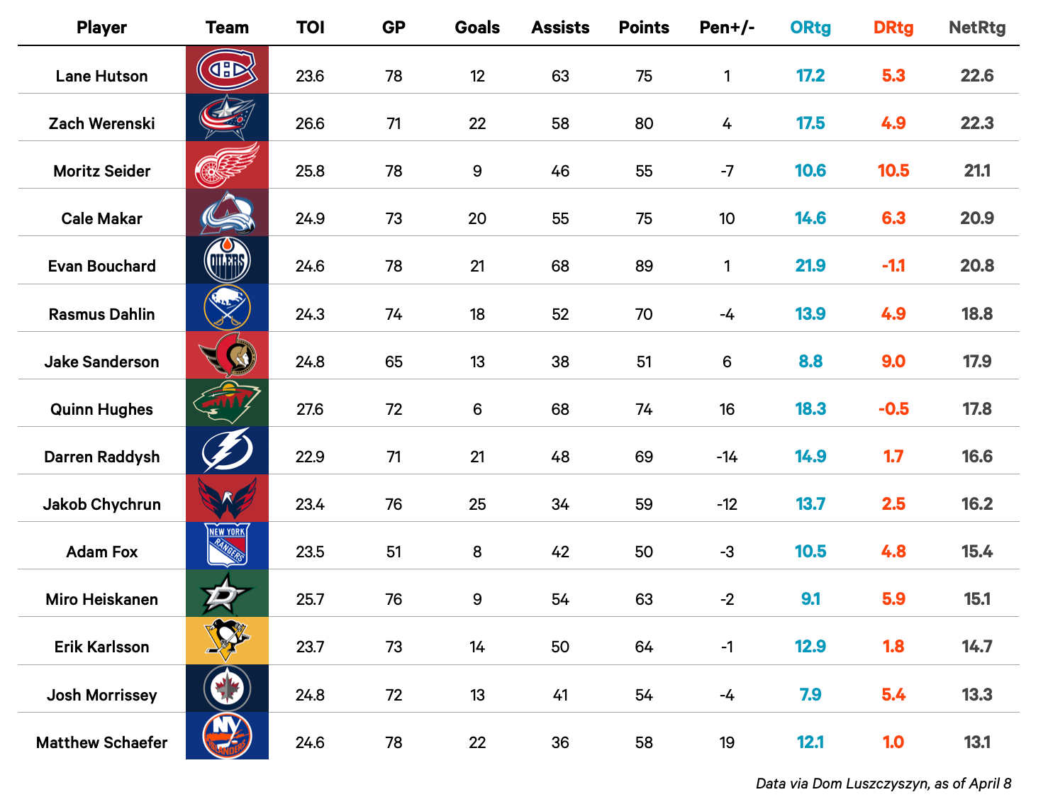 This year, there are true contenders from that perspective as well — defenders who move the needle offensively, without flashy scoring, while calming play down in their own zone. Moritz Seider is the prime example of that, since his 55 points don’t reach that top-tier echelon, and neither does his puck-moving. But Seider still helps facilitate his team’s offense, boosting the Red Wings’ xG by 0.33 per 60, and their scoring by an even stronger degree. His 10.6 Offensive Rating may not stack up to Bouchard’s or Hughes’s, but his secret weapon is being top-15 among defenseman while boasting the best Defensive Rating (plus-10.5) in the league.