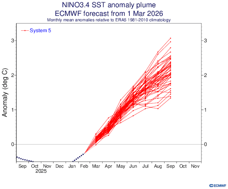 Forecast from March 2026 of the Niño3.4 Index. Red lines indicate different model forecasts.