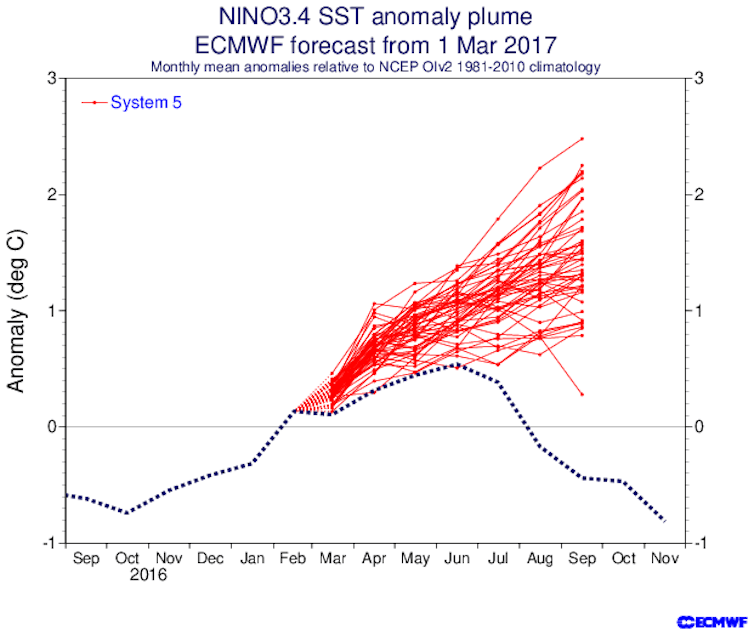 The forecasts made in March 2017 are worth looking at. Here, models confidently predicted a moderate and long-lasting El Niño, similar to forecasts in March 2026. What happened instead was a short-lived, weak El Niño.