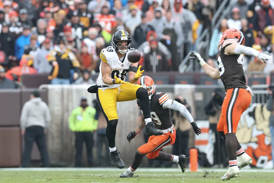Dec 28, 2025; Cleveland, Ohio, USA; Pittsburgh Steelers tight end Pat Freiermuth (88) catches the ball in the second quarter against the Cleveland Browns at Huntington Bank Field. Mandatory Credit: Scott Galvin-Imagn Images