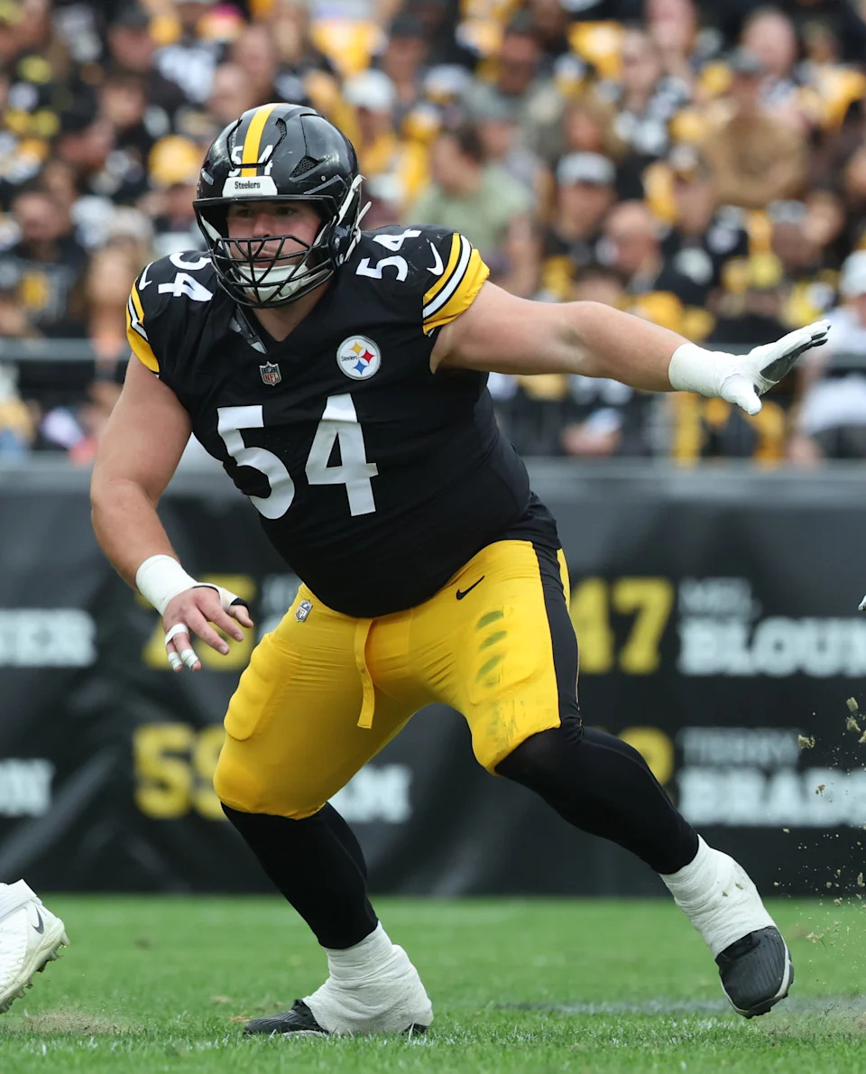 Oct 12, 2025; Pittsburgh, Pennsylvania, USA; Pittsburgh Steelers center Zach Frazier (54) blocks at the line of scrimmage against the Cleveland Browns during the second quarter at Acrisure Stadium. Mandatory Credit: Charles LeClaire-Imagn Images