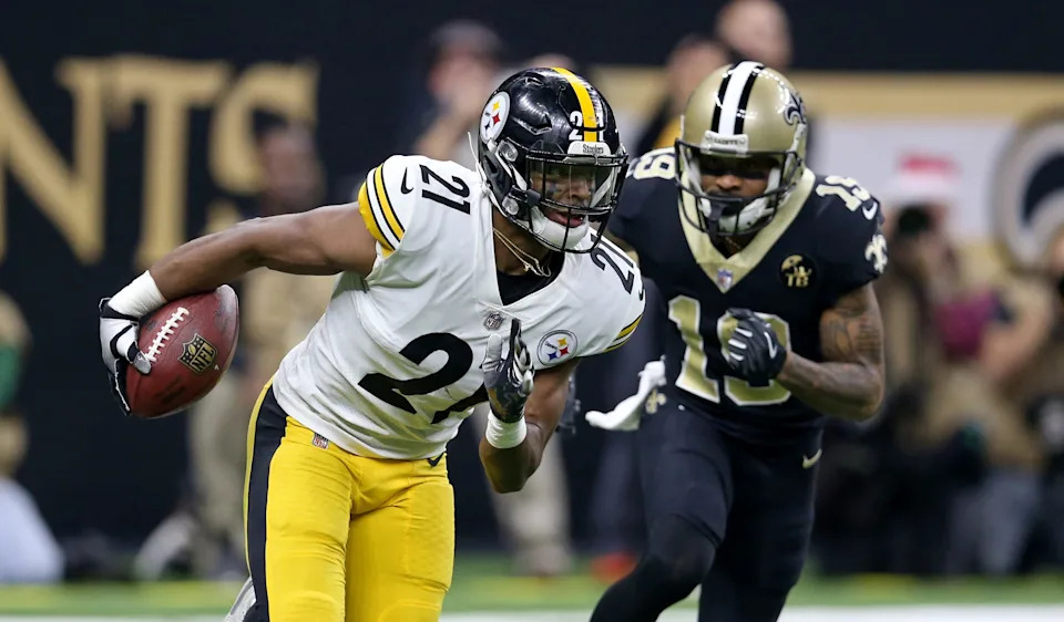 Dec 23, 2018; New Orleans, LA, USA; Pittsburgh Steelers free safety Sean Davis (21) returns an interception with New Orleans Saints wide receiver Ted Ginn (19) pursuing in the first quarter at the Mercedes-Benz Superdome. Mandatory Credit: Chuck Cook-USA TODAY Sports