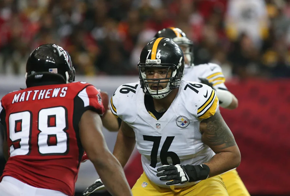 Dec 14, 2014; Atlanta, GA, USA; Pittsburgh Steelers tackle Mike Adams (76) blocks Atlanta Falcons defensive end Cliff Matthews (98) in the third quarter of their game at the Georgia Dome. The Steelers won 27-20. Mandatory Credit: Jason Getz-USA TODAY Sports