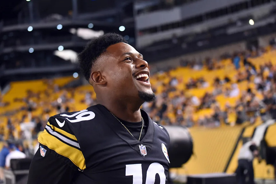 Aug 30, 2018; Pittsburgh, PA, USA; Pittsburgh Steelers wide receiver JuJu Smith-Schuster (19) smiles on the field after their game with the Carolina Panthers at Heinz Field. Mandatory Credit: Philip G. Pavely-USA TODAY Sports