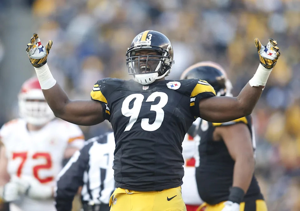Dec 21, 2014; Pittsburgh, PA, USA; Pittsburgh Steelers outside linebacker Jason Worilds (93) reacts after recording a sack against the Kansas City Chiefs during the fourth quarter at Heinz Field. The Steelers won 20-12. Mandatory Credit: Charles LeClaire-USA TODAY Sports