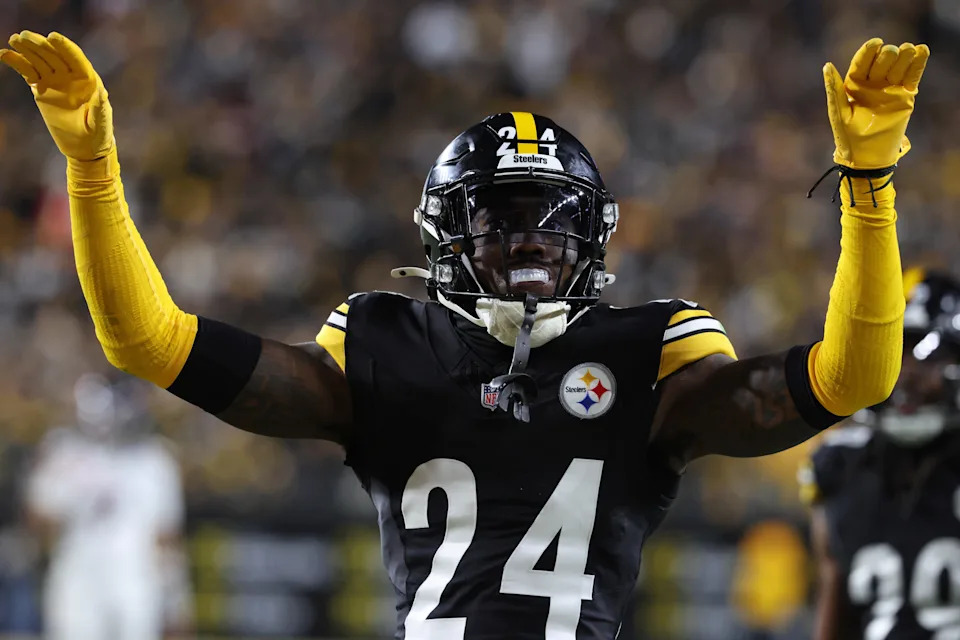 Jan 12, 2026; Pittsburgh, PA, USA; Pittsburgh Steelers cornerback Joey Porter Jr. (24) reacts after a play during the second half of an AFC Wild Card Round game against the Houston Texans at Acrisure Stadium. Mandatory Credit: Charles LeClaire-Imagn Images