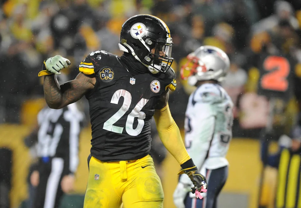 Dec 17, 2017; Pittsburgh, PA, USA; Pittsburgh Steelers running back Le’Veon Bell (26) celebrates a third quarter touchdown against the New England Patriots at Heinz Field. Mandatory Credit: Philip G. Pavely-USA TODAY Sports