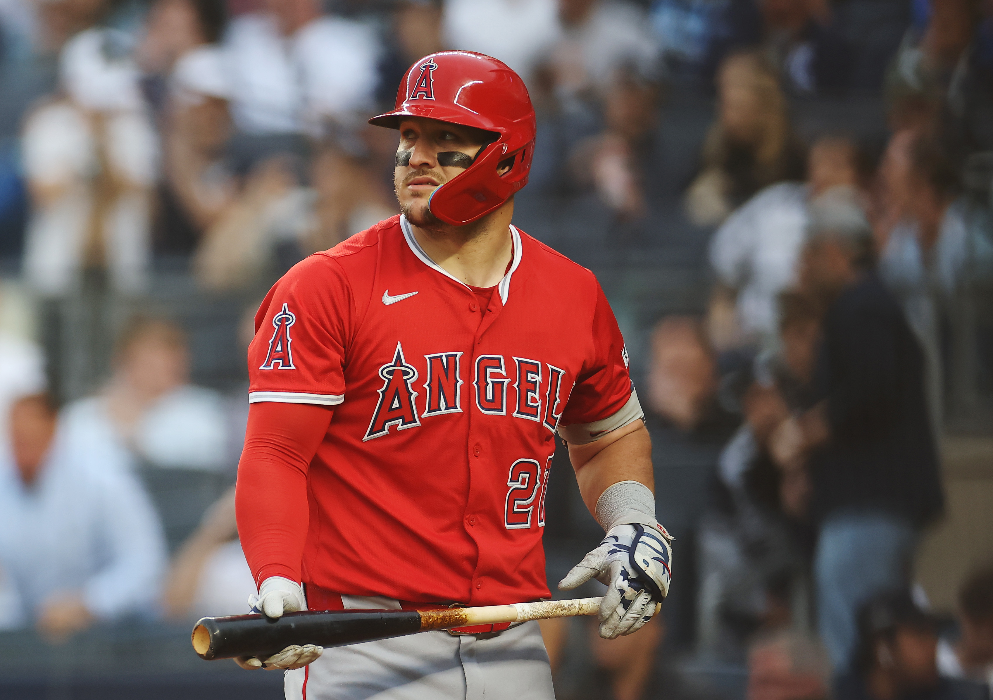 NEW YORK, NEW YORK – JUNE 18: Mike Trout #27 of the Los Angeles Angels looks on before a game against the New York Yankees at Yankee Stadium on June 18, 2025 in New York City. (Photo by Jim McIsaac/Getty Images)