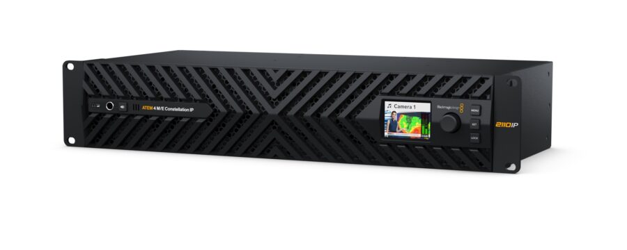 The ATEM 4 M/E Constellation IP (from $7,995) is a native SMPTE-2110 live production switcher with up to 64 inputs and 52 outputs via 100G Ethernet, full standards conversion on every input, 16 Advanced Keyers, 4 multi-views, and 2 SuperSource processors. It retains the familiar ATEM Constellation feature set from the SDI models but in a redesigned front-to-back cooled chassis with SMPTE-2022-7 redundancy on all video ports, plus redundant PTP clock connections.