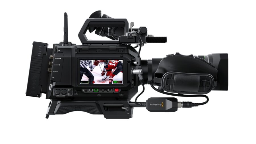 To complete the broadcast package, Blackmagic Design is introducing an optional B4 lens mount that lets users attach electronically controlled broadcast lenses, along with a new 7-inch Studio Viewfinder with a touchscreen that connects and powers via USB-C. A center-crop mode when using B4 lenses allows Ultra HD output at high frame rates. The built-in DaVinci Resolve-based primary color corrector now includes a dedicated 3D LUT processor for the SMPTE-2110 output, separate from the LUTs applied to other outputs, so live grading can be tailored specifically for the broadcast feed.
