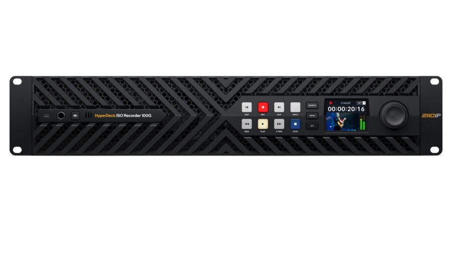 The HyperDeck ISO Recorder 100G ($4,995) records up to 8 channels of Ultra HD Apple ProRes video simultaneously from a single 100G Ethernet connection to network storage. DaVinci Resolve can access files mid-recording for live action replay workflows. The recorder features broadcast deck controls with a machined metal search dial and active clutch, dual redundant 100G Ethernet connections for both video and data, and RS-422 serial control for legacy broadcast automation.
