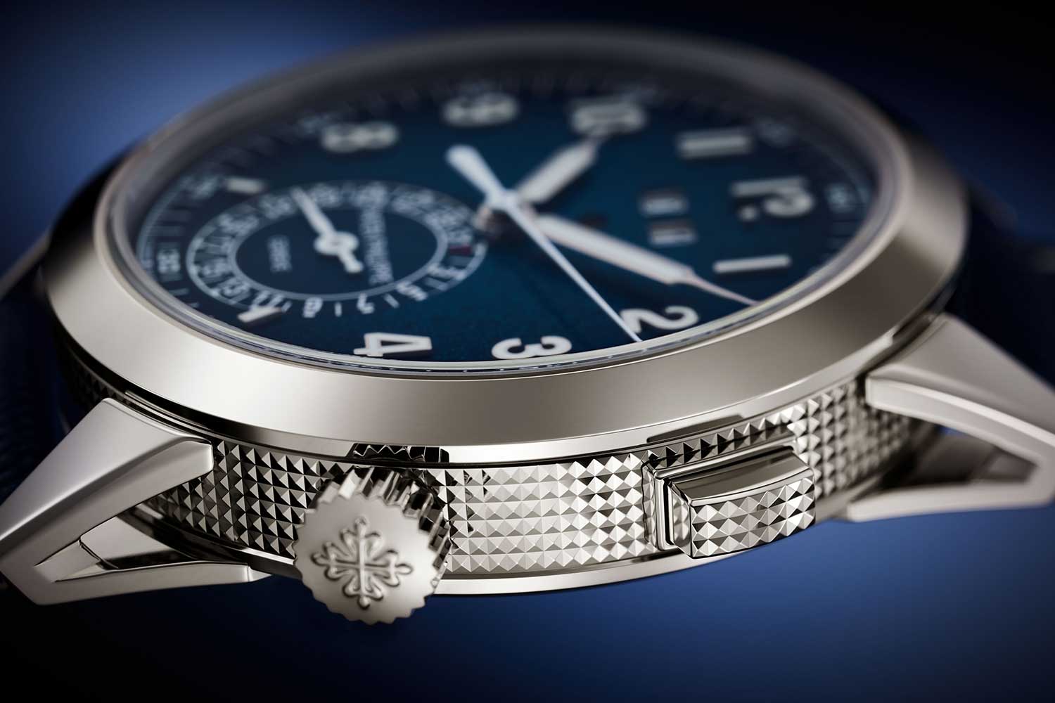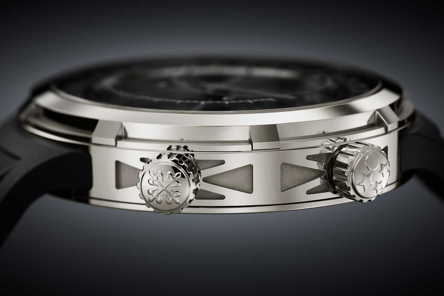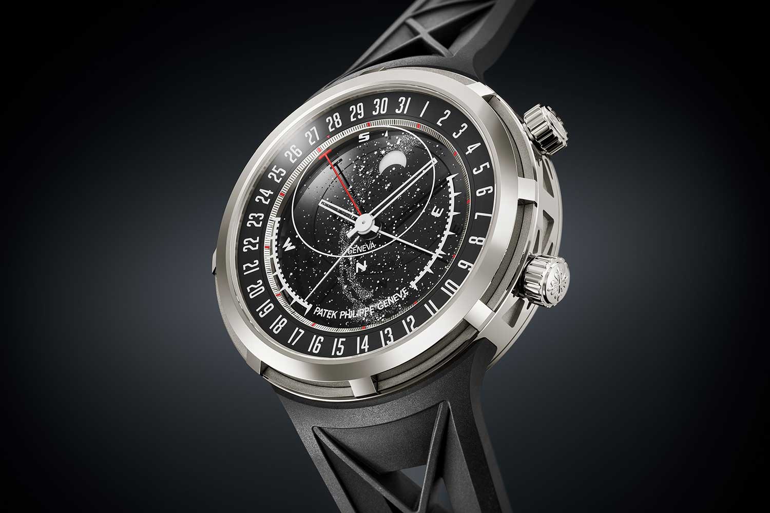 The watch measures 47mm in diameter and 12.39mm in height; sizeable on paper, but likely to wear considerably smaller thanks to its lugless design. The white gold case departs from the classical Celestial format. The case band features an X-shaped motif in relief, alternating between polished and satin-brushed surfaces, a pattern that continues onto the solid caseback, where it is punctuated by a Calatrava Cross. It is fitted with two crowns: one at 4 o’clock for winding and time-setting, and a second at 2 o’clock for adjusting the astronomical indications via a bayonet system that prevents accidental actuation. A corrector set into the caseband handles the date, while two additional pushers at 9 and 10 o’clock control the transition between Summer and Winter time. The strap is integrated directly into the case without lugs.