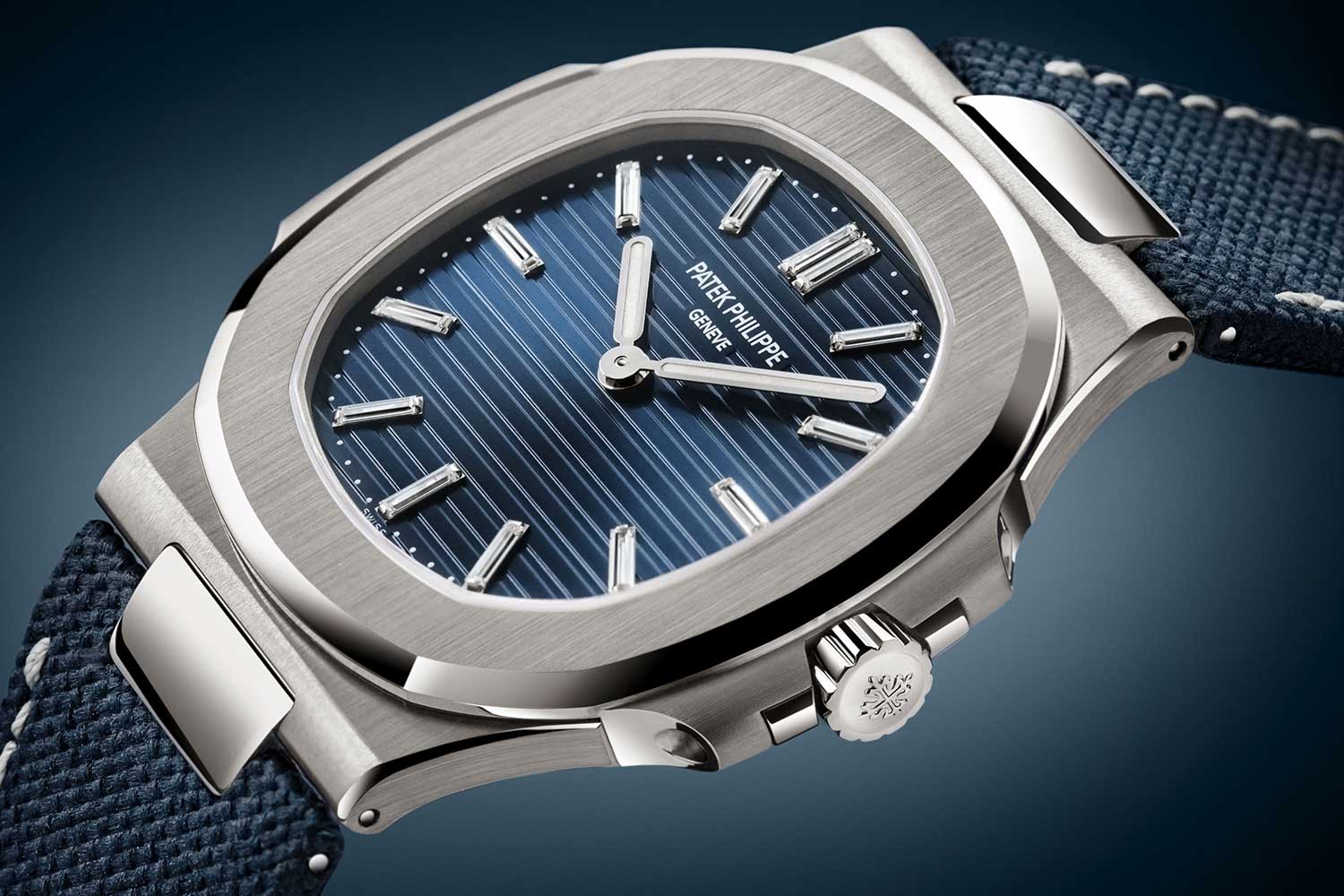 In white gold with a matching bracelet, the Ref. 5810/1G-001 is limited to 2,000 pieces. It sticks closely to the familiar Nautilus formula – applied baton markers and rounded baton hands in white gold, all filled with white luminous material. The companion Ref. 5810G-001, limited to 1,000 pieces, takes a slightly more expressive route. Fitted to a composite strap, it swaps in baguette-cut diamond hour markers set in white gold, adding a measured note of brilliance to an otherwise unchanged design.