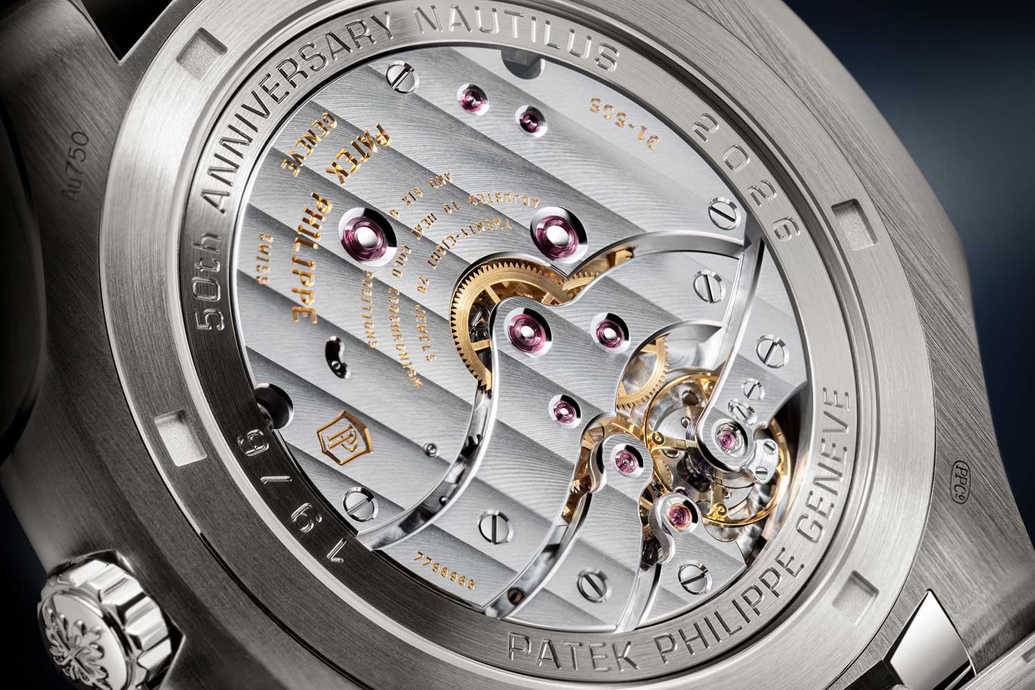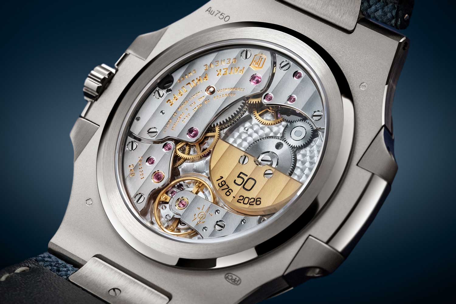 Both are powered by the ultra-thin self-winding Calibre 240, a movement that has long been associated with the Nautilus, specifically the Ref. 5712 and Ref. 5740. Just 2.53mm in height, it remains one of Patek Philippe’s most elegant automatic movements, and the 22k gold micro-rotor is engraved with “50 1976 – 2026” as a small but unmistakable reminder of the occasion.