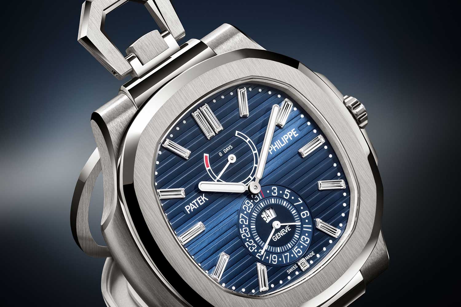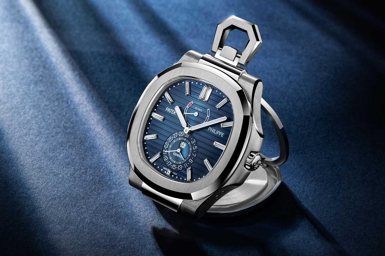 With the ref. 958G-001, Patek Philippe does something that, on paper, sounds unlikely. It turns the Nautilus into a pocket watch/ desk clock, and yet, it works rather well. The familiar elements are all there – the rounded octagonal bezel, the lateral “ears” – only now expanded to 50.65mm across with a hinge cover that doubles as a support for the watch to sit upright on a desk.