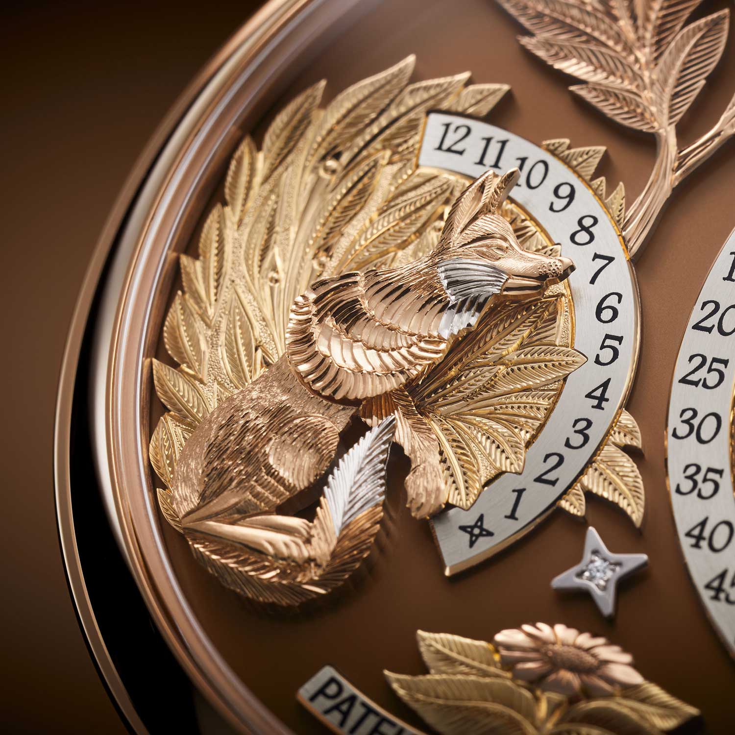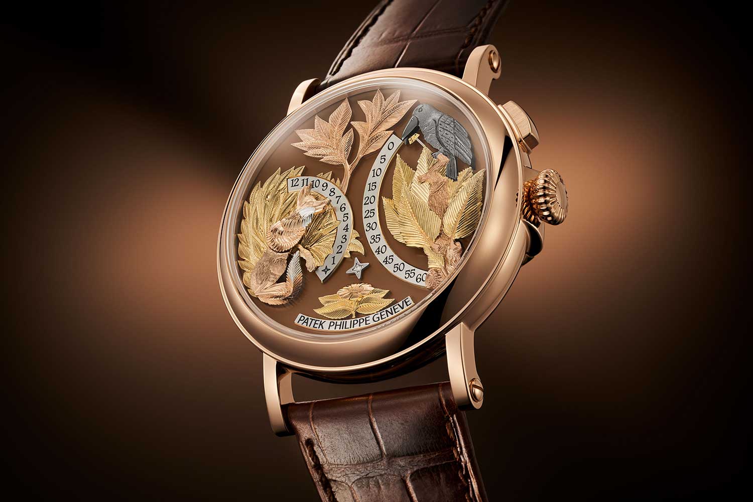 The dial is conceived as a miniature scene, with 10 hand-engraved appliqués in multiple colours of gold set against a brown opaline, solid gold base. They are, at a glance, decorative, but not all of them are merely so. The fox’s head and paws, for instance, are part of the indication, and that changes the terms of the exercise entirely. The material is thin to begin with, down to 0.2mm at its finest, and any excess pressure risks altering the geometry enough to affect the functioning of the watch. Bringing the dial to completion takes on the order of 150 hours of manual work.