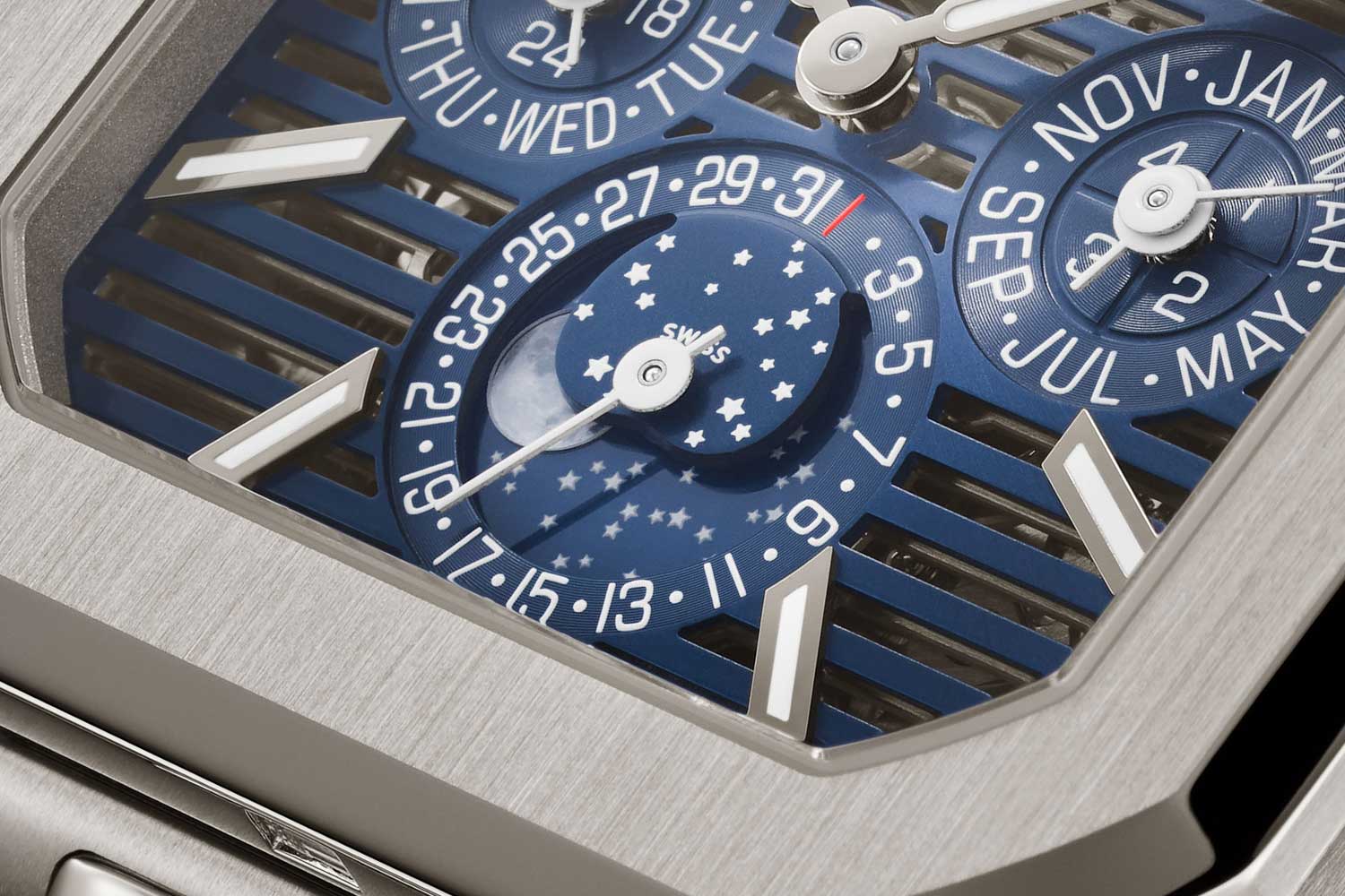The display is made up of two ultra-thin mineral glass discs – one forms the night sky, with engraved and metallised stars set against a blue-varnished backdrop, while the other, inset into it, carries the moon itself. The latter is finished with black metallisation and laser structuring to reproduce the lunar surface. The effect is distinctly more atmospheric and undeniably beautiful.