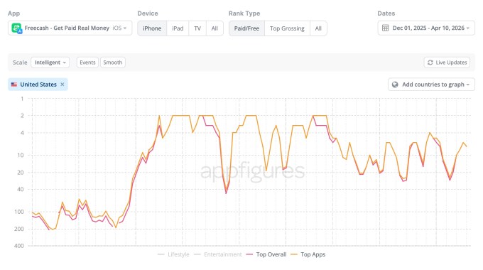 Appfigures told TechCrunch that Freecash’s downloads peaked in February, reaching nearly 6 million, but have since been declining. Current estimates had put the app on track for around 3 million installs in April.