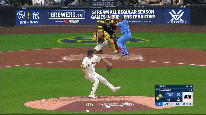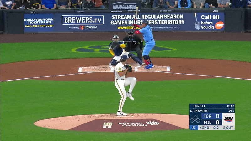 Okamoto saw a team-high 19 breaking balls during that Brewers series — 10 of them outside the strike zone. But he chased only two of those pitches. And when Brandon Sproat missed over the plate with an 0-2 sweeper in Thursday’s second inning, Okamoto pounced and drove it 379 feet to right-centre. Milwaukee’s American Family Field held it. But it would have been a home run at half of MLB’s 30 ballparks, including Rogers Centre.