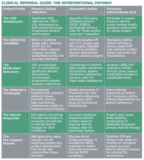 At the completion of this article, the reader should… Identify clinical signs of the interventional window in glaucoma, including ocular surface issues, IOP fluctuations, and steroid responses, to guide timely referral.