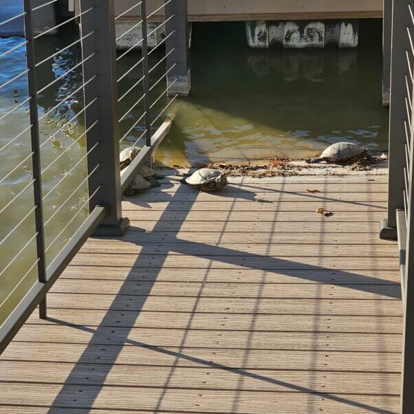 At The Remy on the Trails apartment complex in Houston, a channelized (surrounded by concrete or brick) pond reportedly serves as home to dozens of native red-eared slider turtles. According to locals, the complex has removed a ramp—the semi-aquatic turtles’ sole means of accessing dry ground. Making matters worse, it being egg-laying season for them, any animals unable to reach soil to lay their eggs can become egg-bound, leading to ruptured organs, infection, and eventually an agonizing death. The turtles have reportedly been stranded in the water for more than two weeks already, with only one small basking rock to fight for, leaving the rest deprived of the daily 10-12 hours of sunlight required for Vitamin D3 synthesis—essential for calcium absorption, which prevents metabolic bone disease and ensures a hard shell.