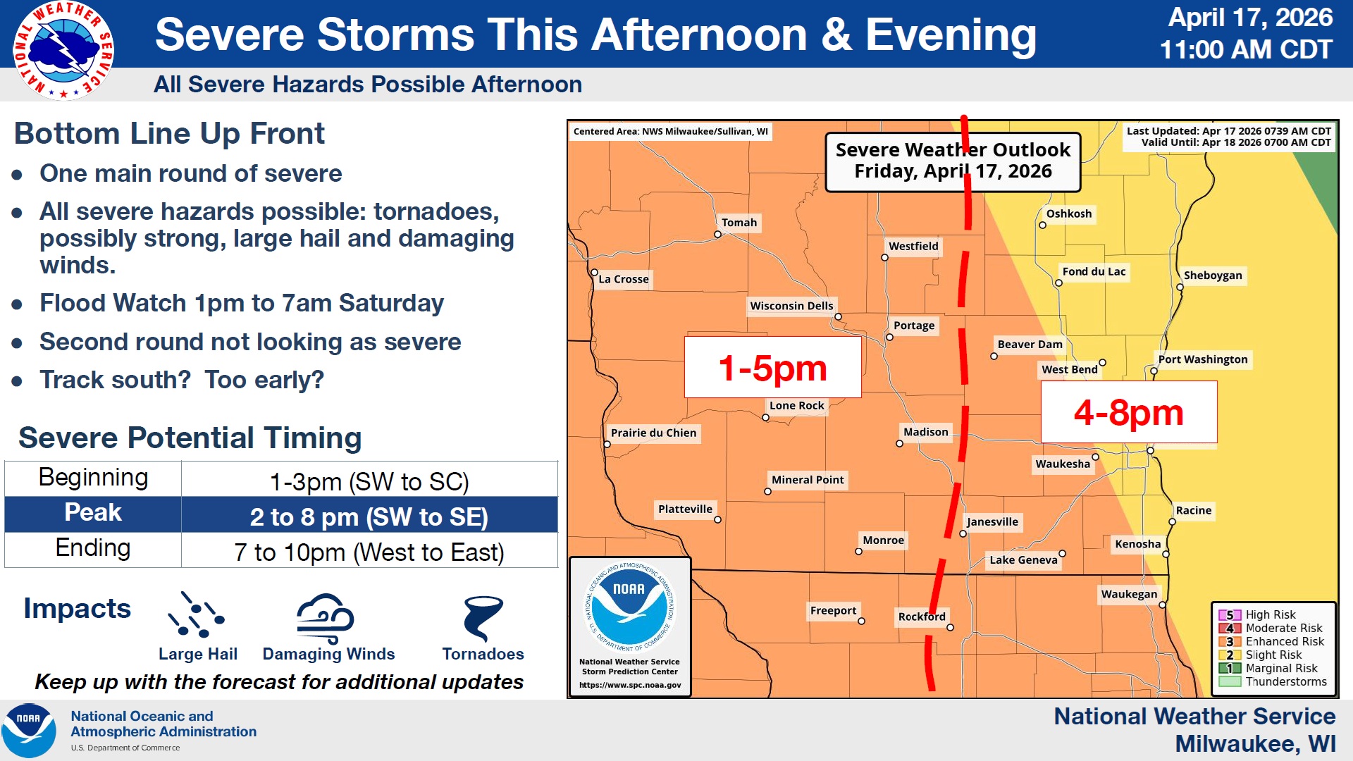 While activity will begin earlier west of the Wisconsin River, Sheboygan and other eastern Wisconsin counties can expect activity mostly between 4 and 8 PM.  Besides the watch for tornadoes, a Flood Watch is also in effect until 7 AM Saturday, as soil conditions are saturated and any additional rainfall will only exacerbate flooding conditions.