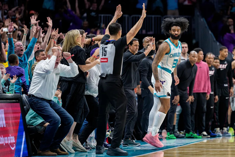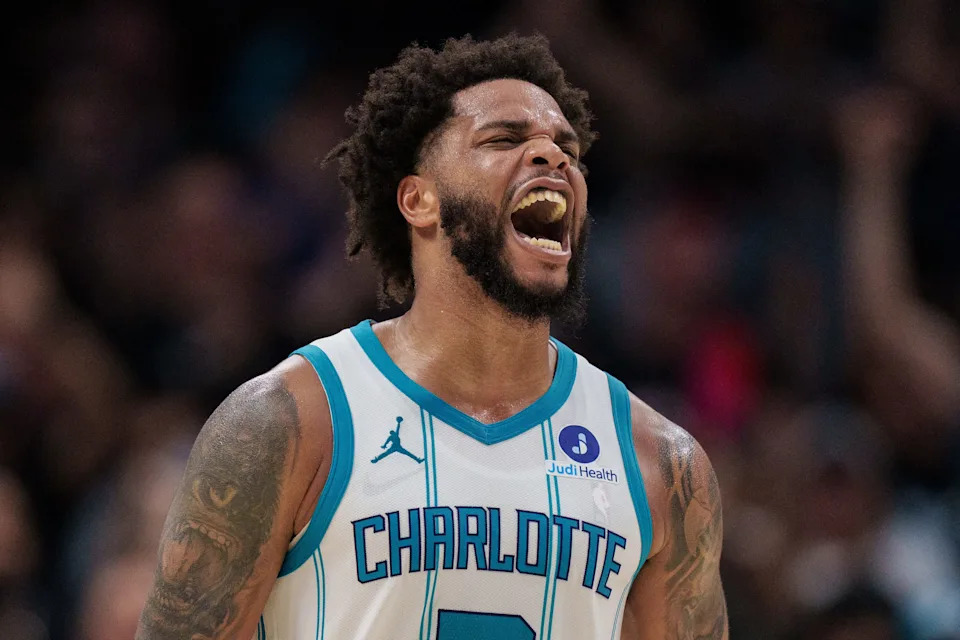 Miles Bridges #0 of the Charlotte Hornets reacts after defeating the Miami Heat during their game at Spectrum Center on April 14, 2026, in Charlotte, North Carolina.