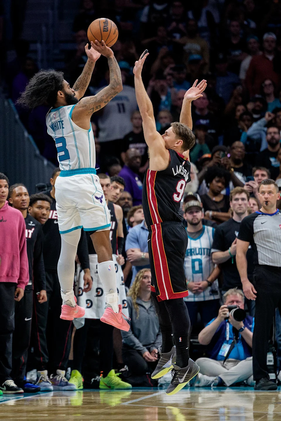 Coby White #3 of the Charlotte Hornets shoots the ball over Pelle Larsson #9 of the Miami Heat late in the second half during their game at Spectrum Center on April 14, 2026, in Charlotte, North Carolina.
