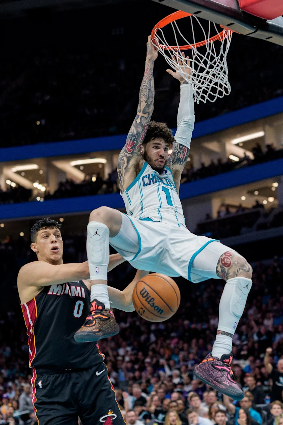 LaMelo Ball #1 of the Charlotte Hornets dunks the ball in the first half while guarded by Simone Fontecchio #0 of the Miami Heat during their game at Spectrum Center on April 14, 2026, in Charlotte, North Carolina.