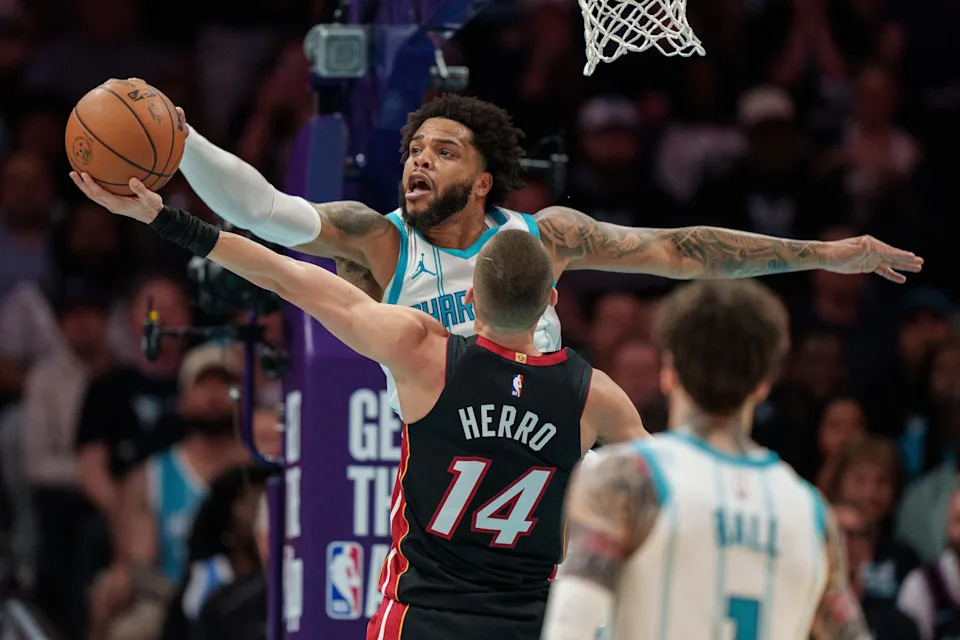 Miles Bridges #0 of the Charlotte Hornets blocks a shot from Tyler Herro #14 of the Miami Heat in the first half during their game at Spectrum Center on April 14, 2026, in Charlotte, North Carolina.