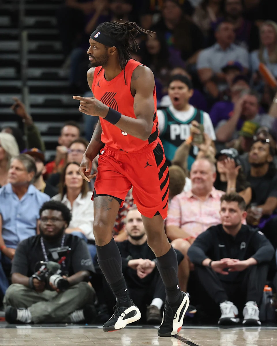 Jerami Grant #9 of the Portland Trail Blazers reacts to a three-point shot against the Phoenix Suns during the second half of an NBA play-in tournament game at Mortgage Matchup Center on April 14, 2026, in Phoenix, Arizona. The Portland Trail Blazers defeated the Suns 114-110.
