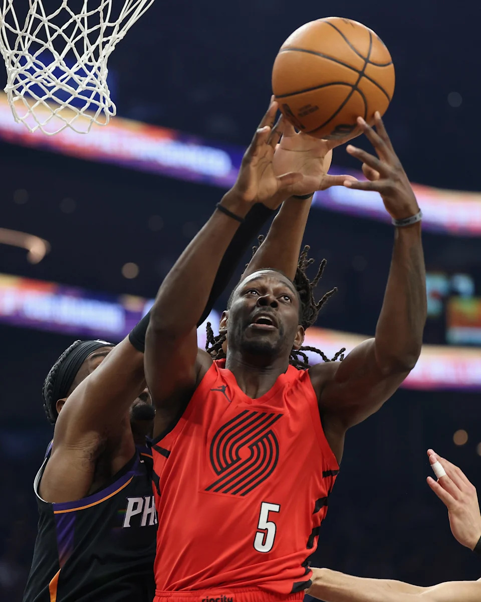 Jrue Holiday #5 of the Portland Trail Blazers attempts a shot under pressure from Mark Williams #15 of the Phoenix Suns during the first half of an NBA play-in tournament game at Mortgage Matchup Center on April 14, 2026, in Phoenix, Arizona. The Portland Trail Blazers defeated the Suns 114-110.
