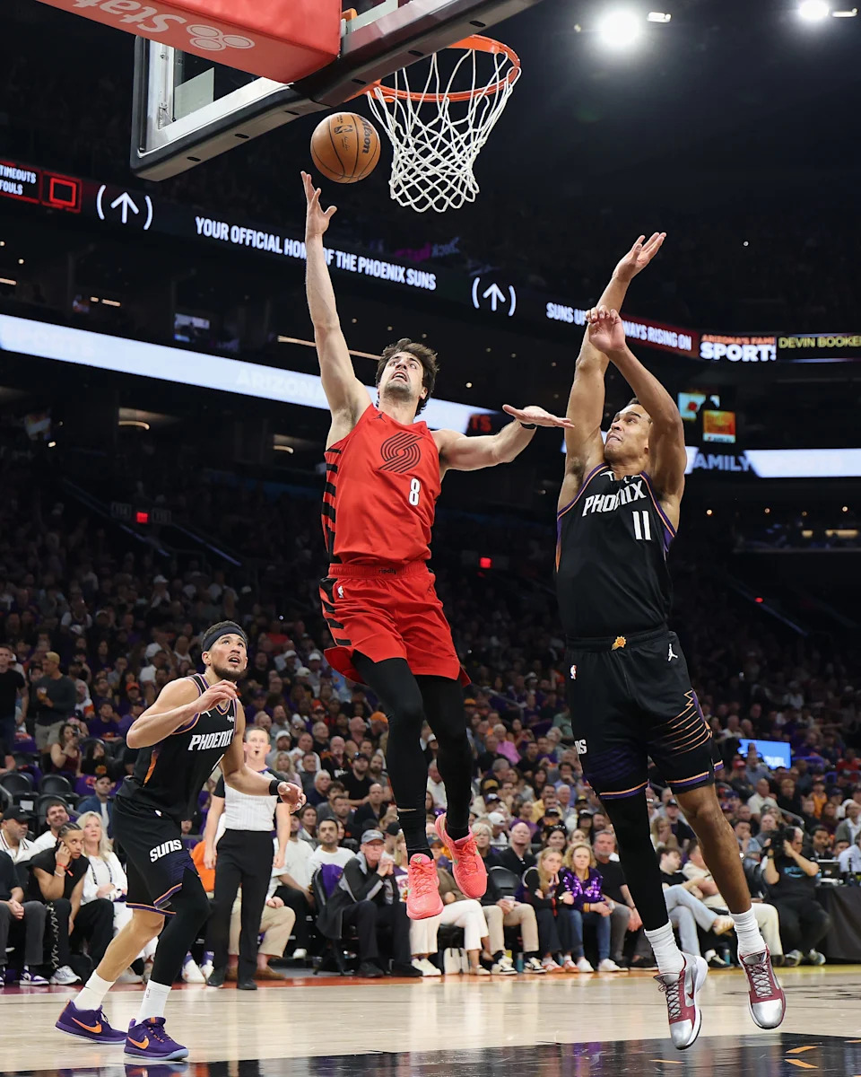 Deni Avdija #8 of the Portland Trail Blazers lays up a shot ahead of Oso Ighodaro #11 and Devin Booker #1 of the Phoenix Suns during the first half of an NBA play-in tournament game at Mortgage Matchup Center on April 14, 2026, in Phoenix, Arizona. The Portland Trail Blazers defeated the Suns 114-110.