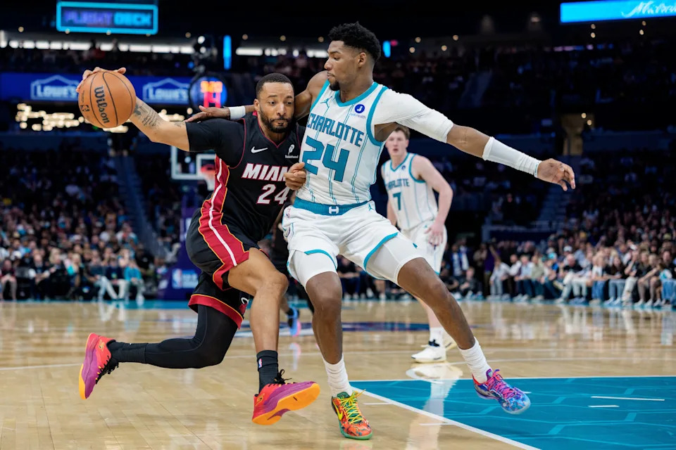 Norman Powell #24 of the Miami Heat drives to the basket while guarded by Brandon Miller #24 of the Charlotte Hornets in the second half during their game at Spectrum Center on April 14, 2026, in Charlotte, North Carolina.