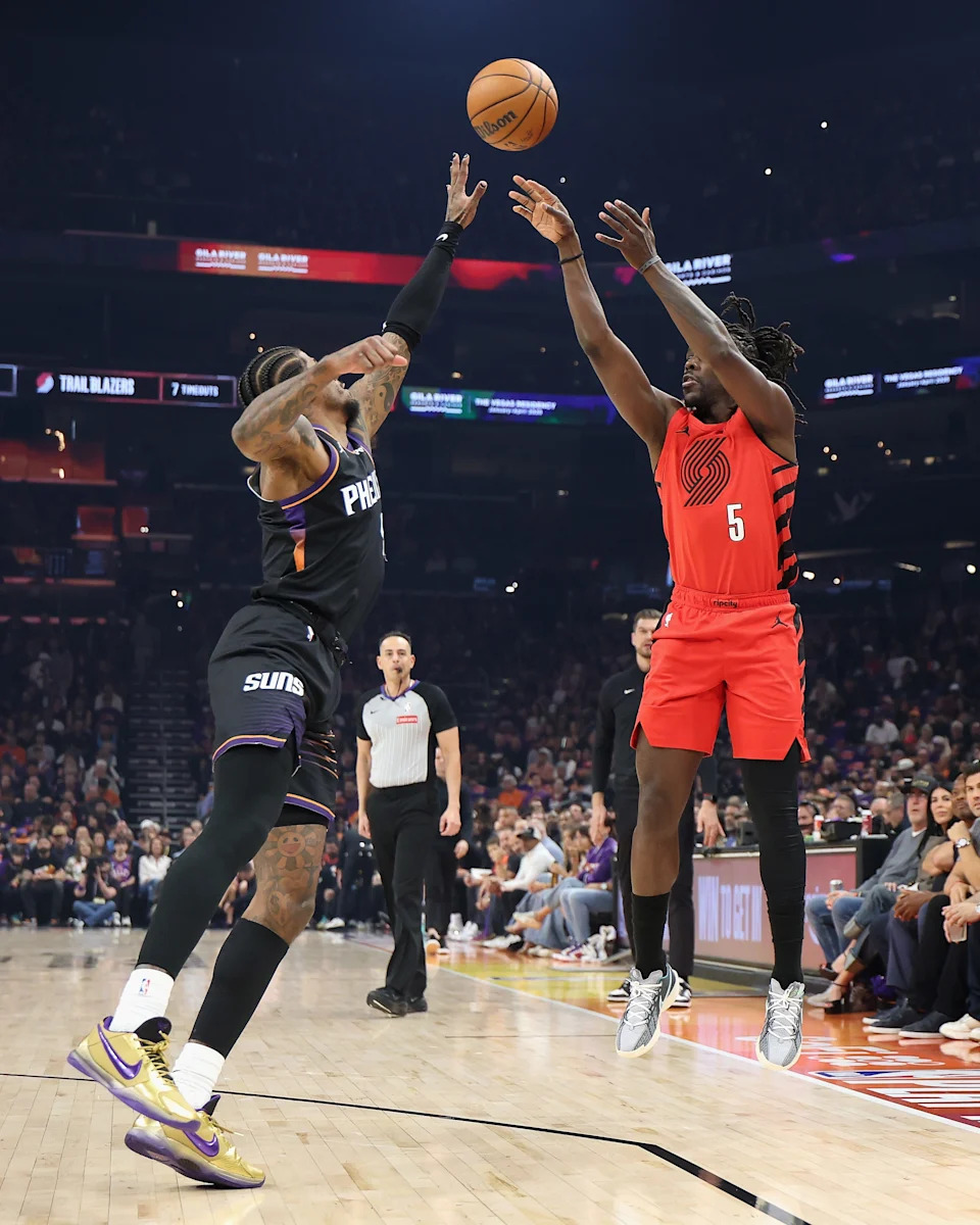 Jrue Holiday #5 of the Portland Trail Blazers attempts a three-point shot over Jalen Green #4 of the Phoenix Suns during the first half of an NBA play-in tournament game at Mortgage Matchup Center on April 14, 2026, in Phoenix, Arizona.