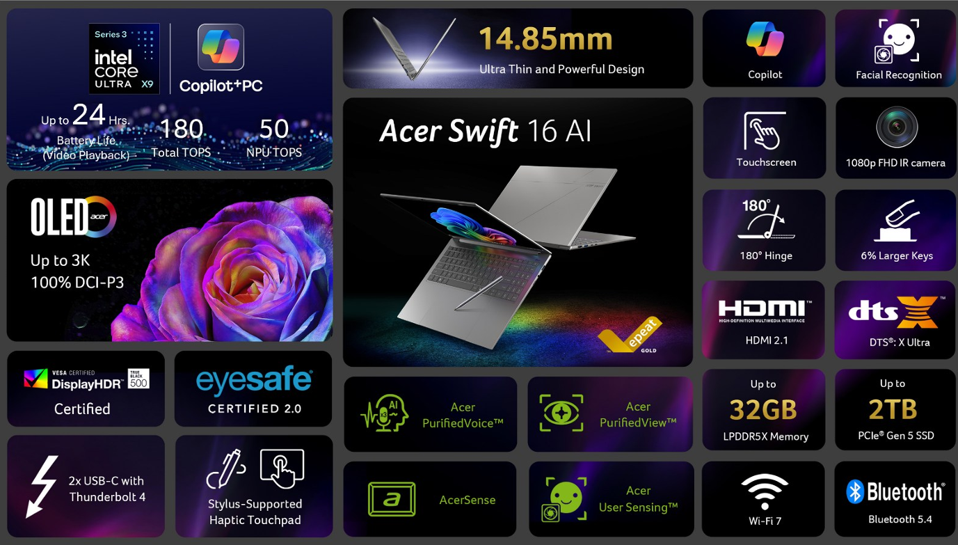 The ACER Swift 16 AI is a Copilot+ PC that blends premium design with performance, offering multiple hardware options so you can work anywhere.