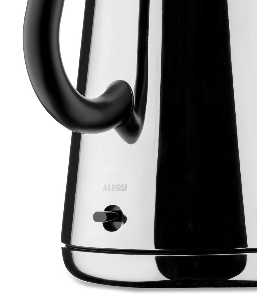 Taking advantage of Alessi’s distinguishing metalworking techniques, which is the origin of the company, the stainless-steel body is shaped simply like a pitcher. The handle coming out from the top seems to go through the side of the body, forming a continuous line to the spout.A handle of a kettle is usually gripped from the side, but thanks to the top-suspended shape, the kettle can be easily lifted from the power base, and hot water can be poured smoothly by holding the upper part of the handle as a fulcrum and lightly tilting the kettle.