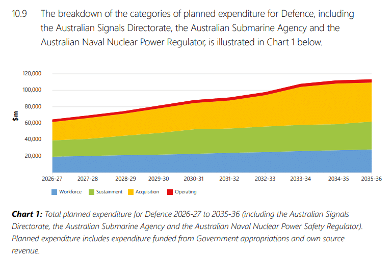 AUKUS takes centre stage across both papers. The bulk of spending for acquisition unsurprisingly goes towards AUKUS Pillar 1, purchasing nuclear powered submarines for the Australian Navy. Notably, Canberra projects total expenditure on Defence until FY35 to effectively double. Spending on acquisitions will substantially increase its proportional share. At present, this element amounts to a third of the total budget. By FY 2035 this share will increase to almost half of al defence spending. In contrast, sustainment is projected to increase less rapidly, in line with a more modern fleet. Government also expects workforce costs to grow very moderately. This assessment seems remarkable given existing and anticipated recruitment challenges. Additionally the requirement for a substantial increase in qualified personnel operating new capabilities also appears to drive an increase in expenses.