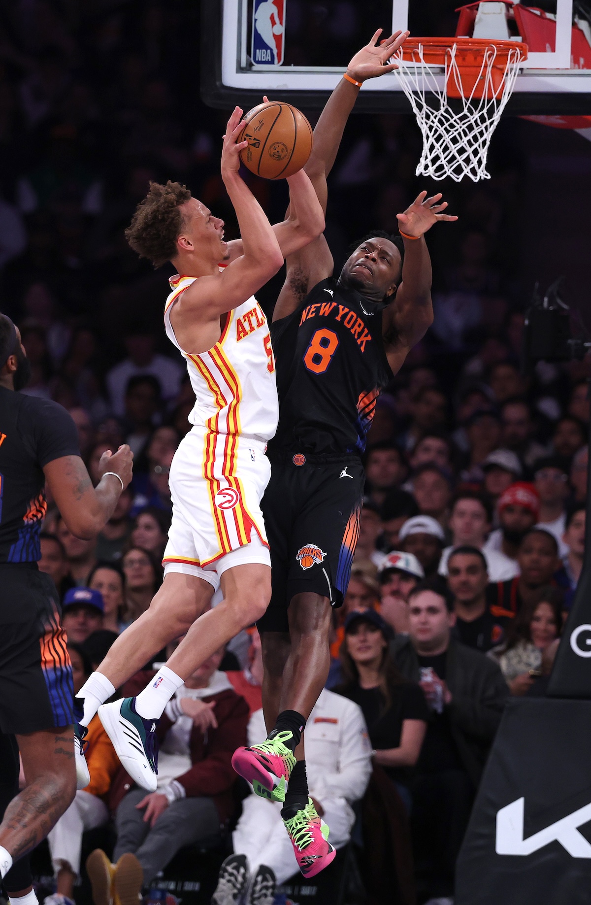 Australian Atlanta Hawks guard Dyson Daniels drives on New York Knicks forward OG Anunoby during Game 2 of the Eastern Conference first round at Madison Square Garden. Photo: Al Bello/Getty ImagesKnicks fade after three quarters of control