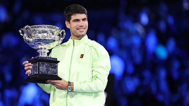 Carlos Alcaraz of Spain with the trophy after winning the 2026 Australian Open. Getty