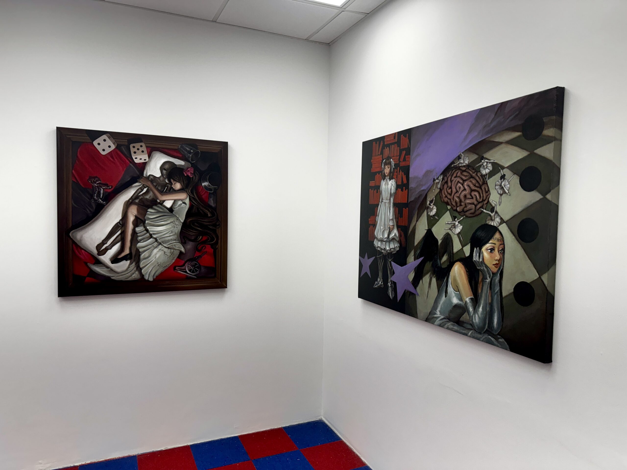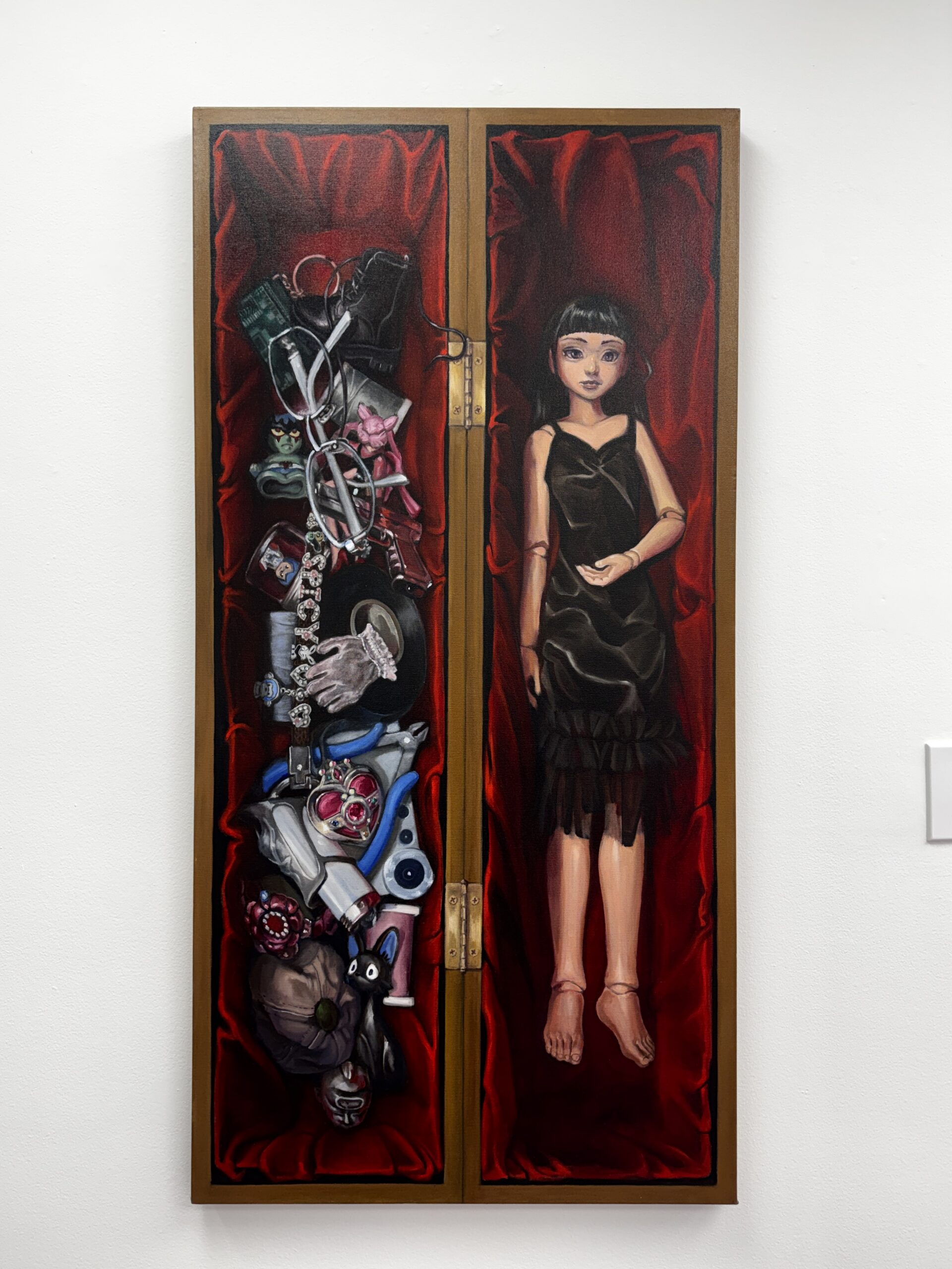 Nathalie Nguyen spent her teen years lurking on LiveJournal blogs and selling digital drawings of furries on the internet, and her debut solo exhibition doesn’t stray far from her roots. Over at Whaam!, a 7-piece oil painting series feels just like stepping into a moody child’s fantasy from the 90s. Hyperrealist dolls, Polly Pocket shoes, and puppets are the stars of the show, complimented by the gallery’s playful blue-and-red checkered floors. Nguyen’s fascinations with toys, nostalgia and the internet have established her niche in the art world, where she’s known for designing freaky sneakers and streetwear as the co-founder of Happy99, and for landing collaborations with Marc Jacobs and Reebok. Just before the show’s opening last Friday, we sent Nguyen a questionnaire to ask her about hustling online, collecting, and the importance of being bored.