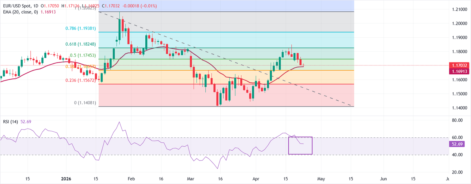 EUR/USD is marginally down to near 1.1700 during the early European trade on Thursday. The pair has corrected to near the 20-period exponential moving average (EMA), which is at 1.1691, but sits north of the 38.2% Fibonacci retracement at 1.1666 of the 1.1408–1.2082 swing, suggesting underlying demand on shallow pullbacks.