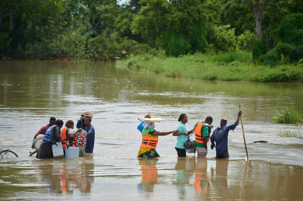 Carrying their vaccines, a group of health workers cross a flooded area in Gonja sub-district in Northern Ghana.