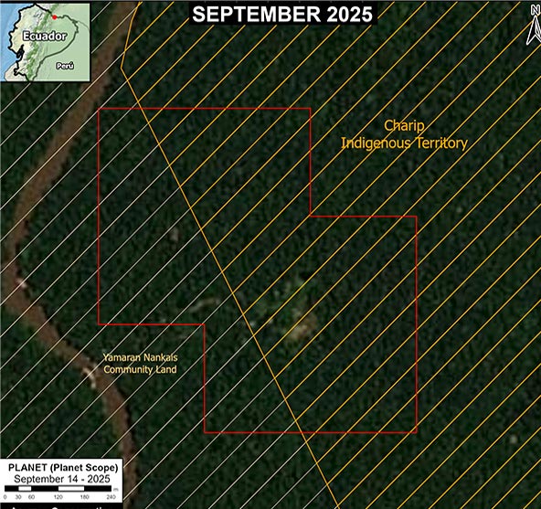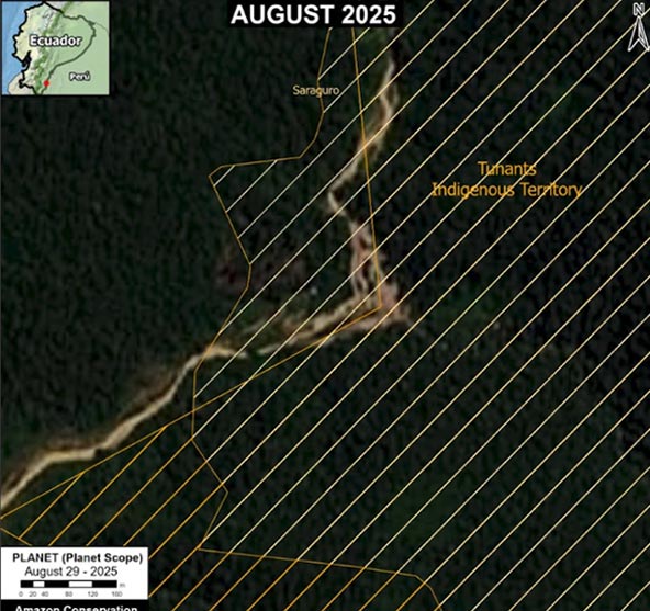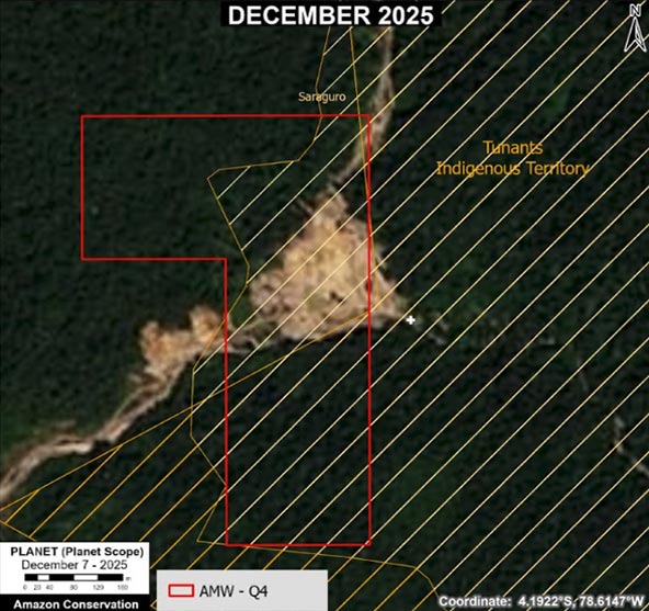 The Tunants Indigenous Territory in Ecuador registered a new mining scar in the last quarter of 2025. Images courtesy of Amazon Conservation.