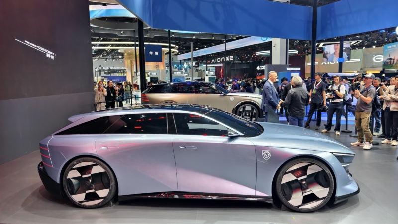 Dongfeng Peugeot and Dongfeng Citroën presented four concept vehicles. The Peugeot Polygon concept includes a rectangular steering interface enabled by steer-by-wire technology. The vehicle also includes 3D-printed recycled materials and configurable interior elements.